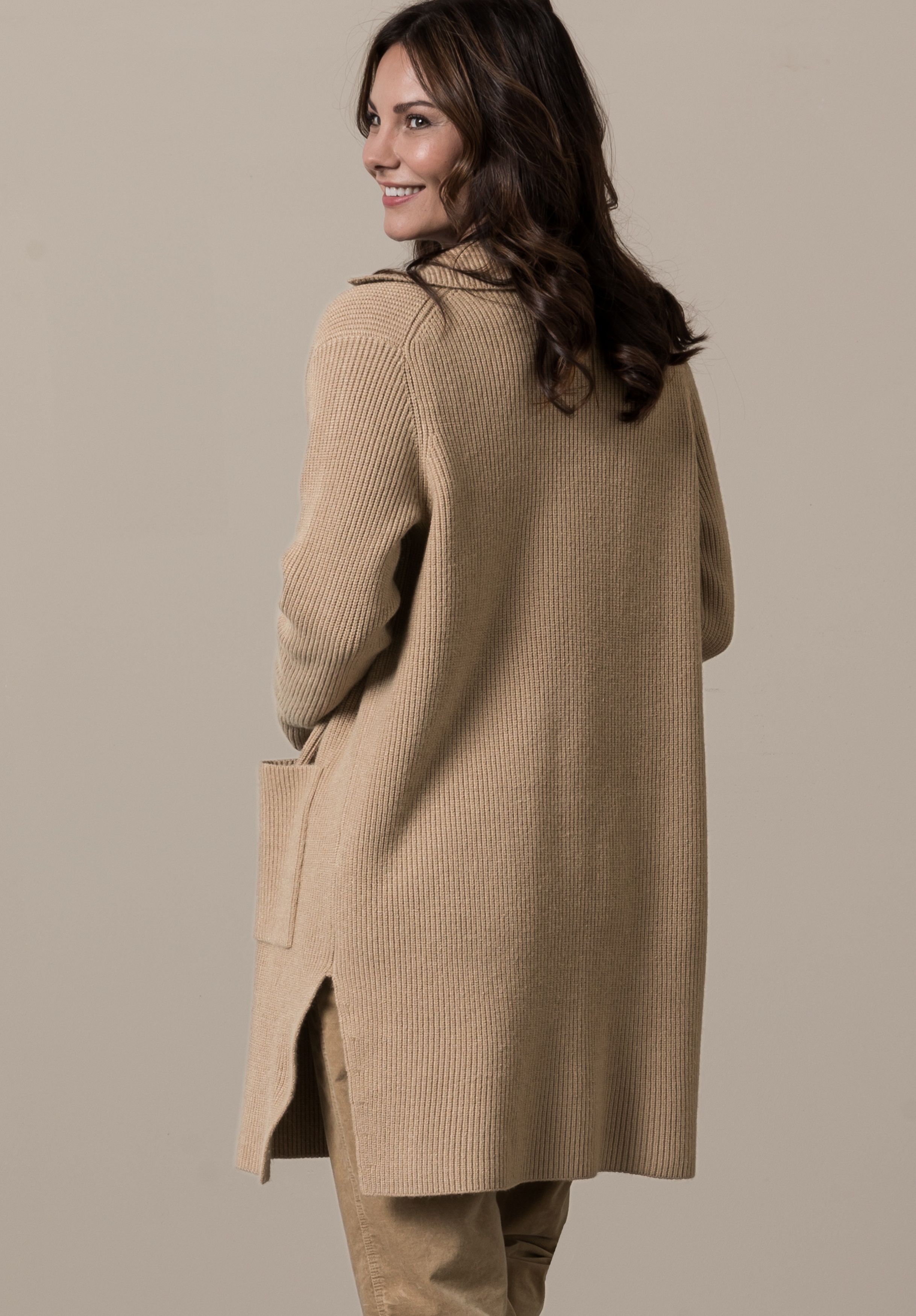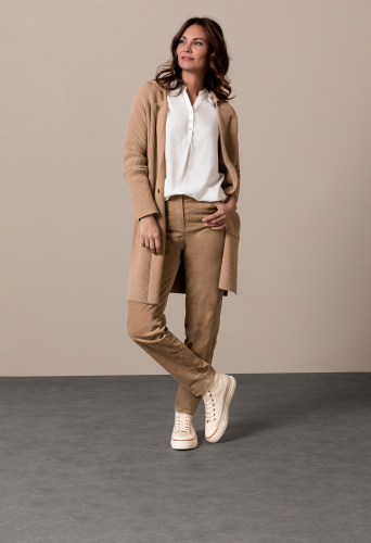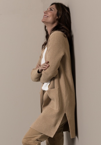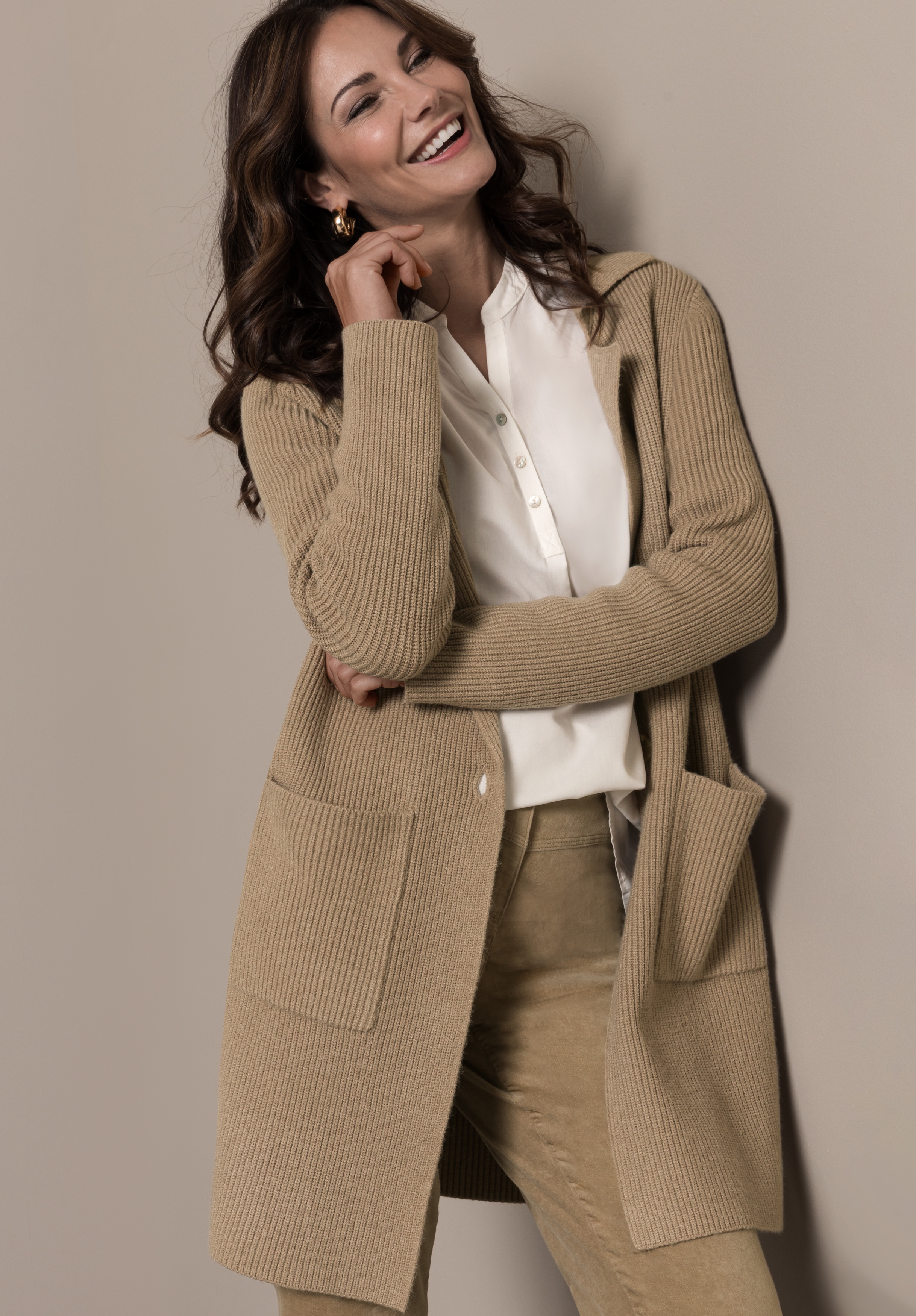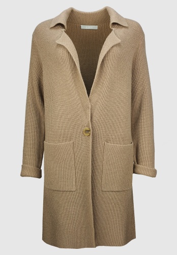 На сайте указаны российские размеры. Повседневный кардиган модной тонкой вязки. Благодаря сочетанию высококачественных материалов он не только сохраняет тепло, но и обеспечивает приятное ощущение уюта. Модный вид тонкой вязки, легкий воротник с лацканами и застежка на 1 пуговицу. Длинные рукава и свободный прямой крой завершают стильный образ. Длина модели в 44 размере около 85 см.