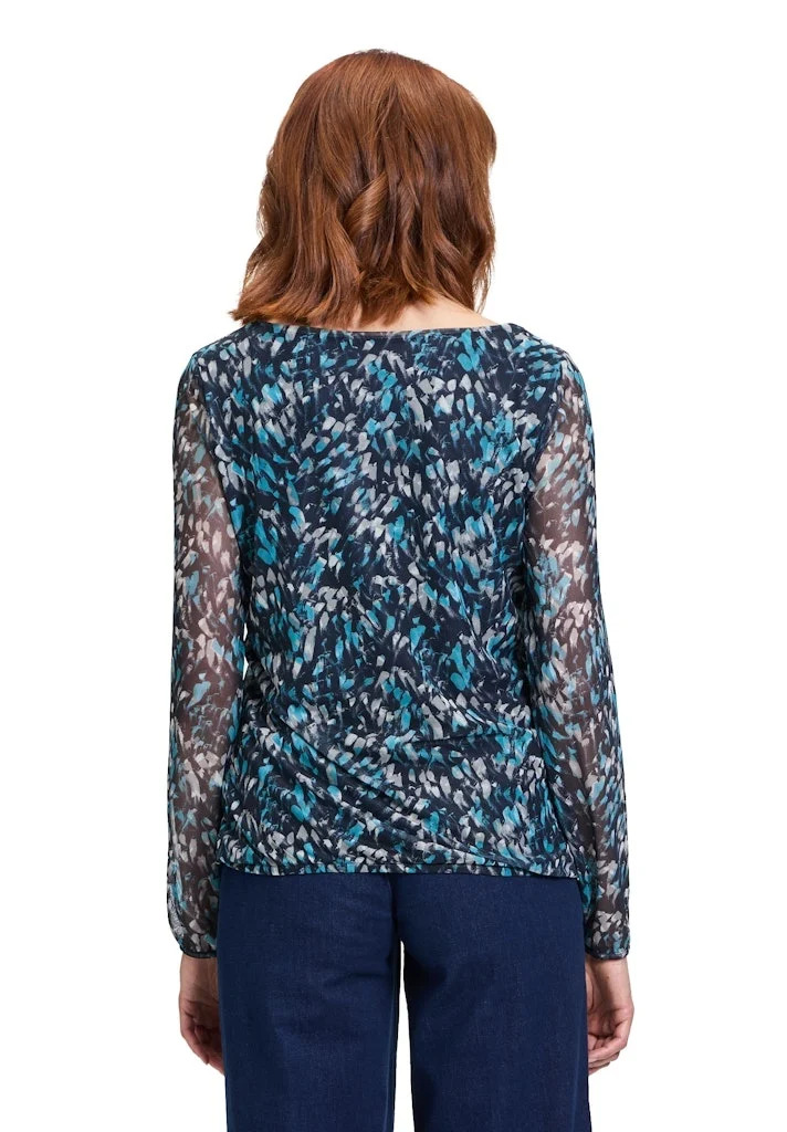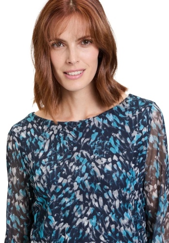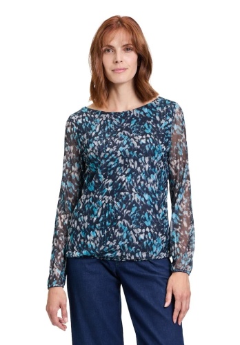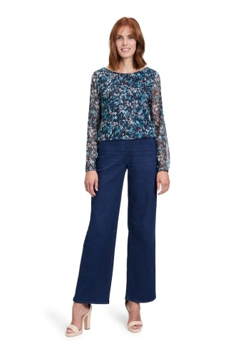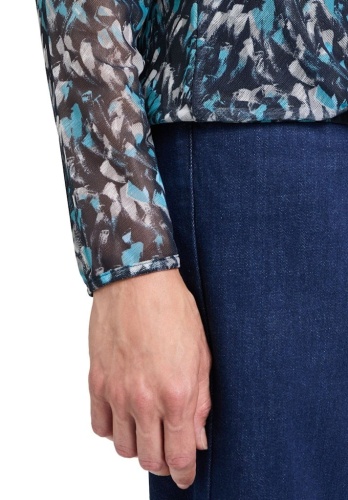 Стильный джемпер с абстрактным узором в оттенках синего, выполненный из легкой ткани с прозрачными рукавами, привнесет свежий акцент в ваш образы и идеально подойдет для разнообразных повседневных случаев.
