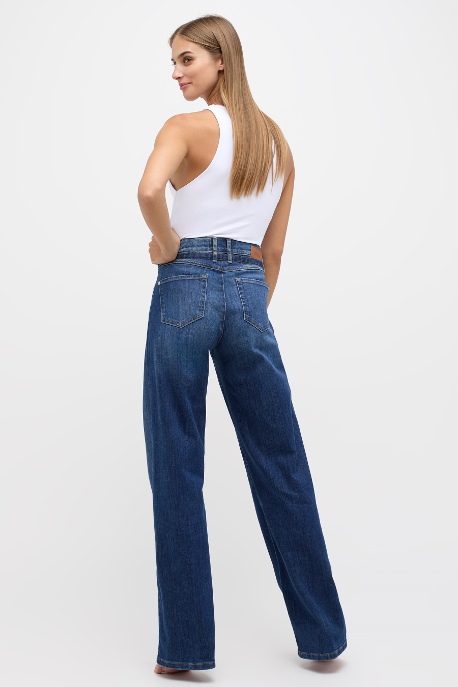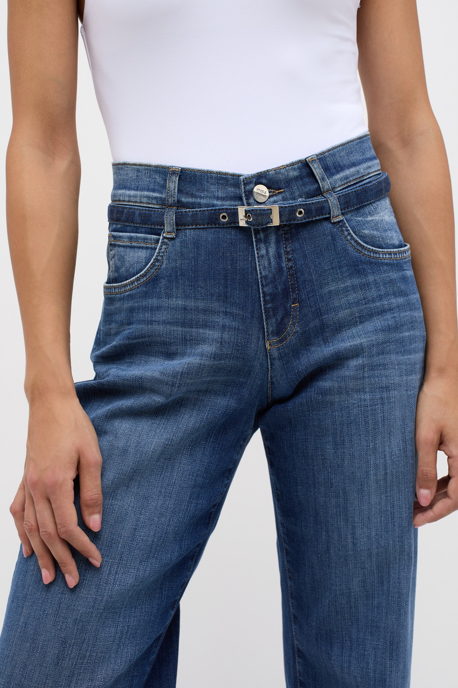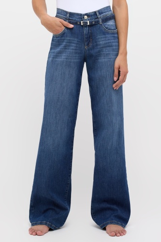 Джинсы прямого кроя cо средней посадкой бренда Angels. Двойные шлёвки и ремень на поясе. Пять карманов, застежка на металлическую пуговицу и молнию.