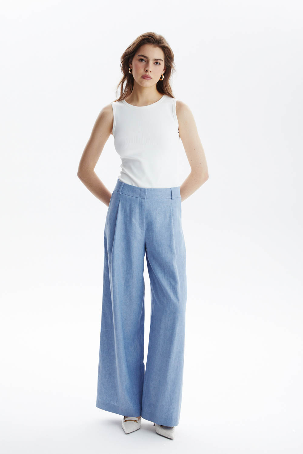 Брюки свободного кроя с широкой ногой. Светло-голубой оттенок брюк освежает образ, а легкая и дышащая ткань идеально подходит для весенне-летнего сезона, обеспечивая комфорт и свободу движения. Брюки идеально подходит как для прогулок по городу, так и для более формальных мероприятий, выражая уверенность и стиль.