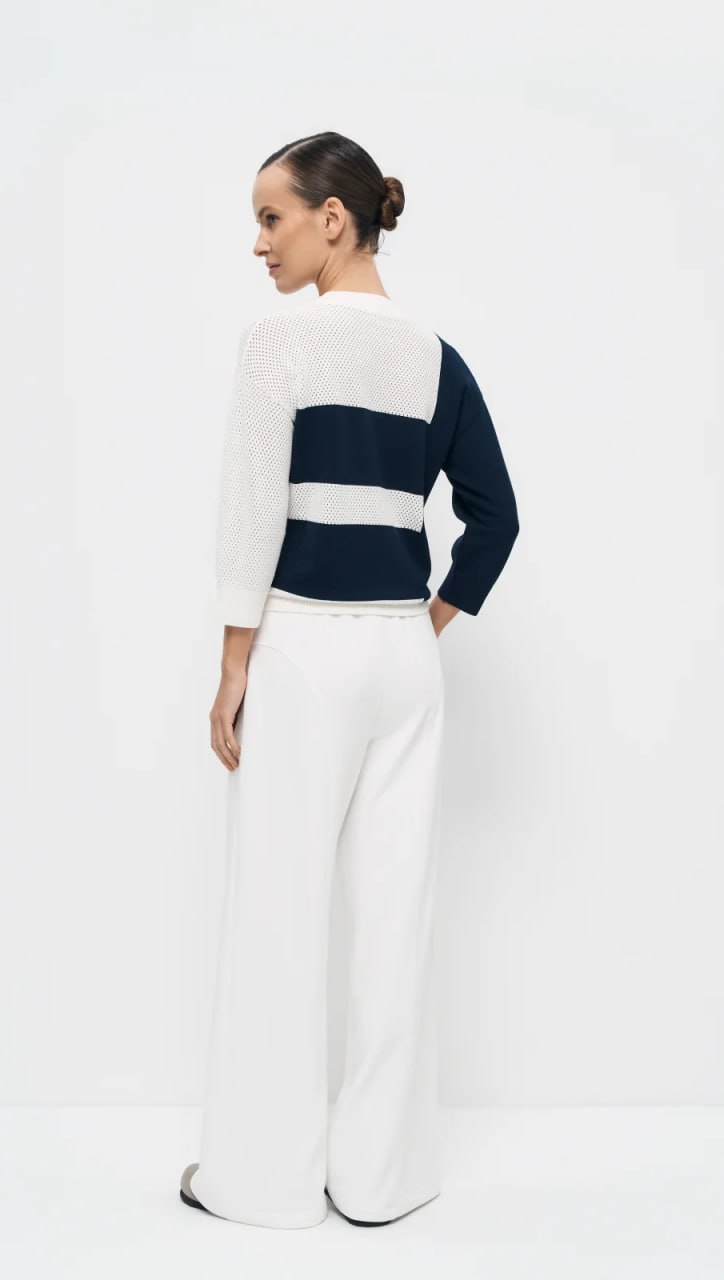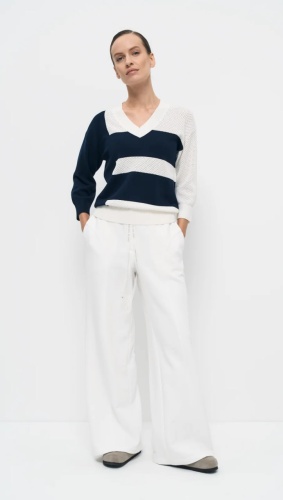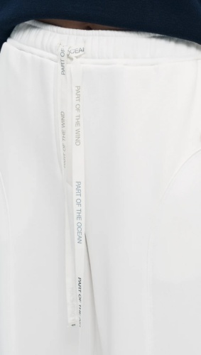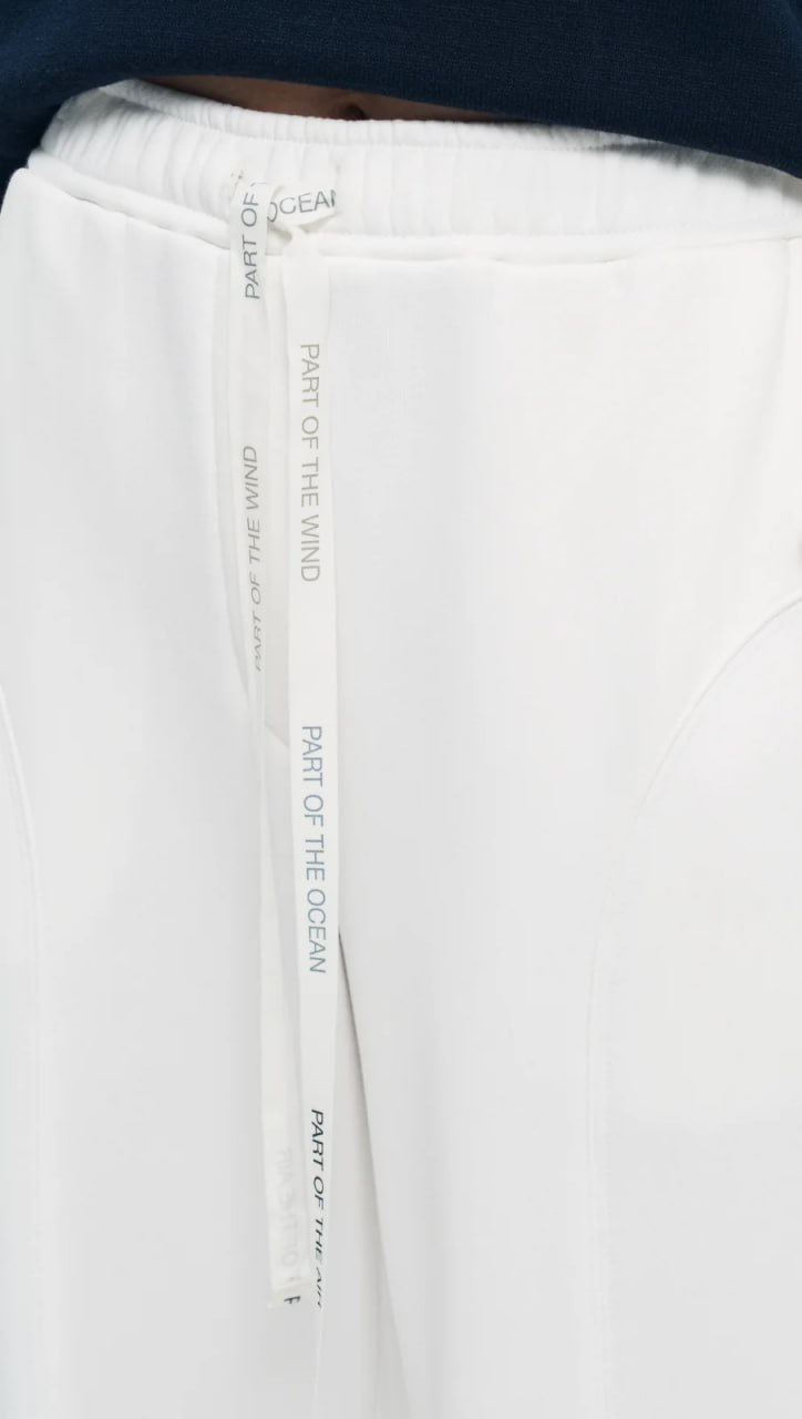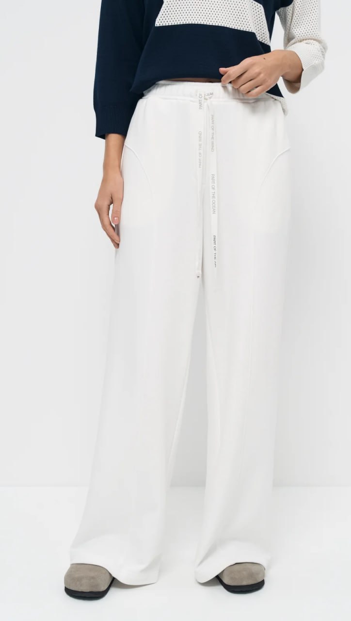 Брюки полной длины изготовлены с хлопковым составом, что делает их мягкими и удобными для повседневной носки. Цвет брюк – «ванильный зефир» – яркий и насыщенный, напоминающий сладость. В поясе брюк расположена лента, декорированная авторским принтом, на котором написаны имена различных стихий