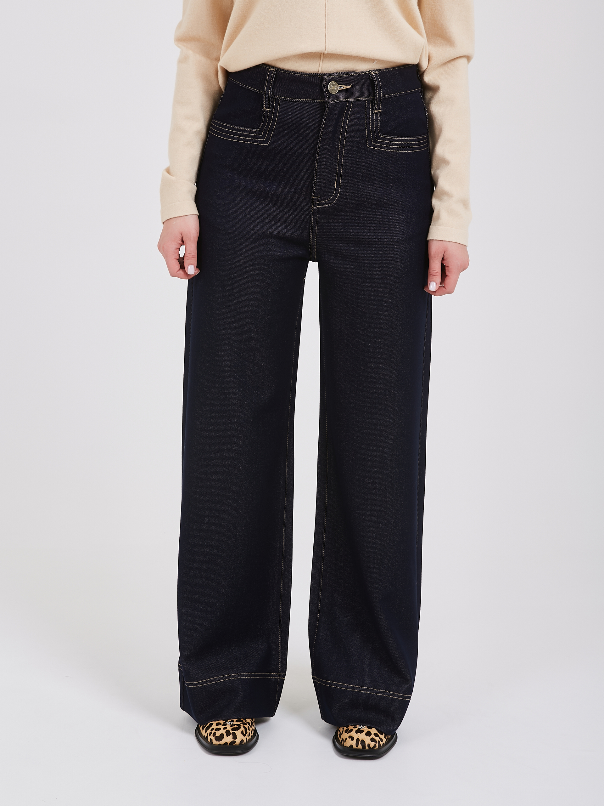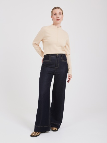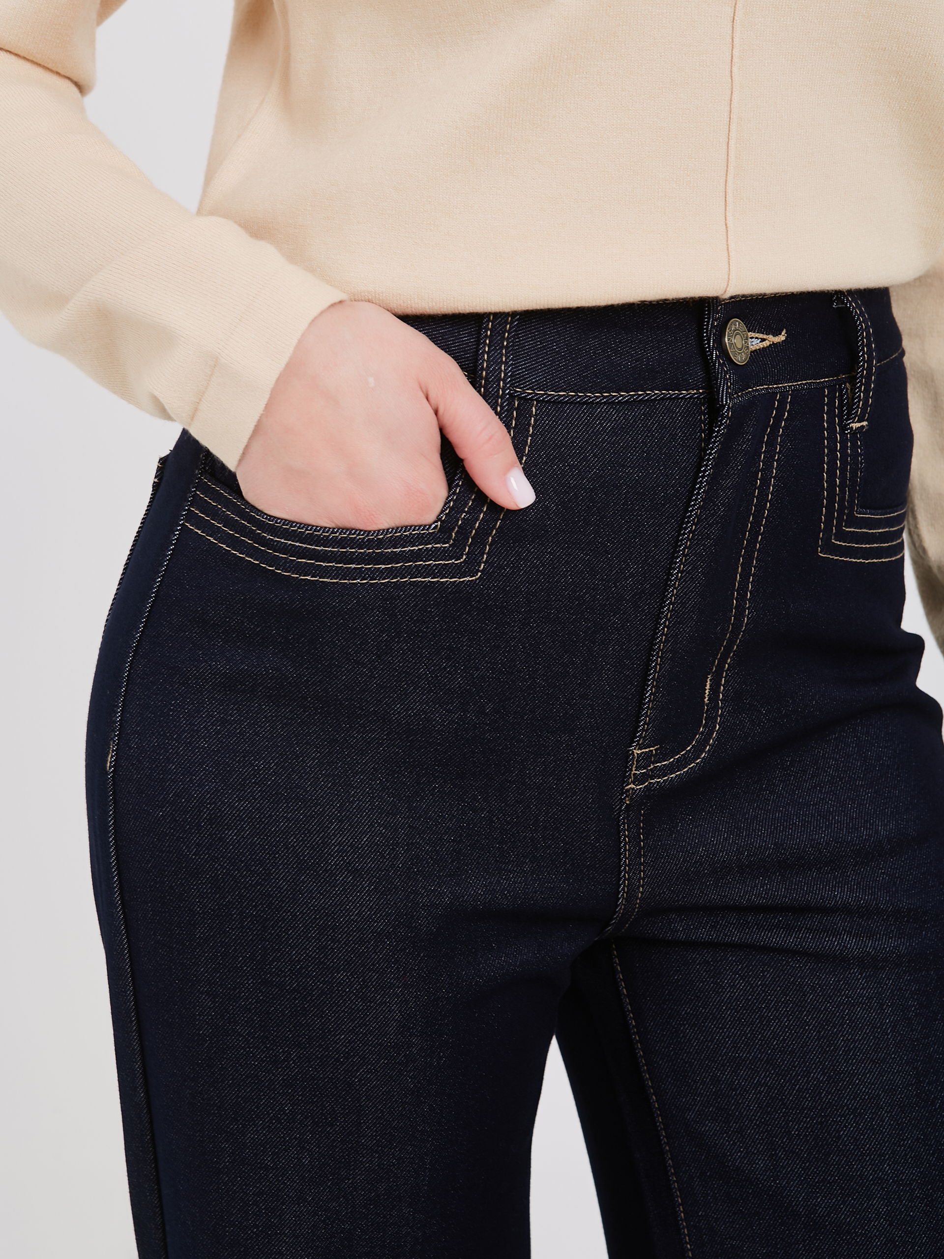 Джинсы синего цвета выполнены из плотной, но струящейся ткани. Яркая контрастная строчка за счет которой джинсы сочетаются с бесконечным множеством трикотажа. Средняя посадка, полная длина и заметное расширение от бедра книзу создают комфортный и свободный силуэт, идеально сидящий на любой фигуре. Осень-Зима'25/26. Капсула "Алые Паруса"