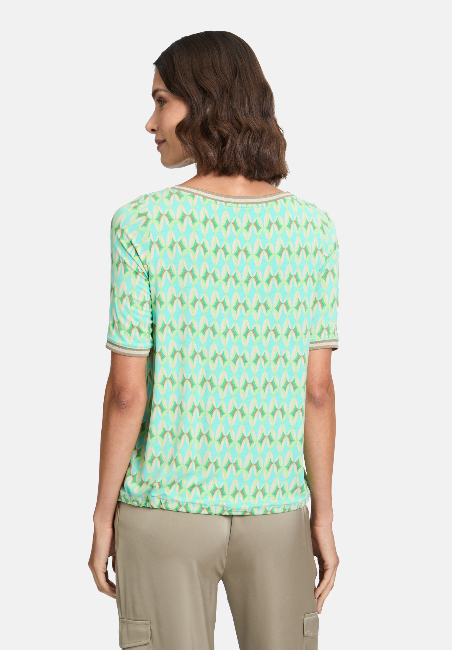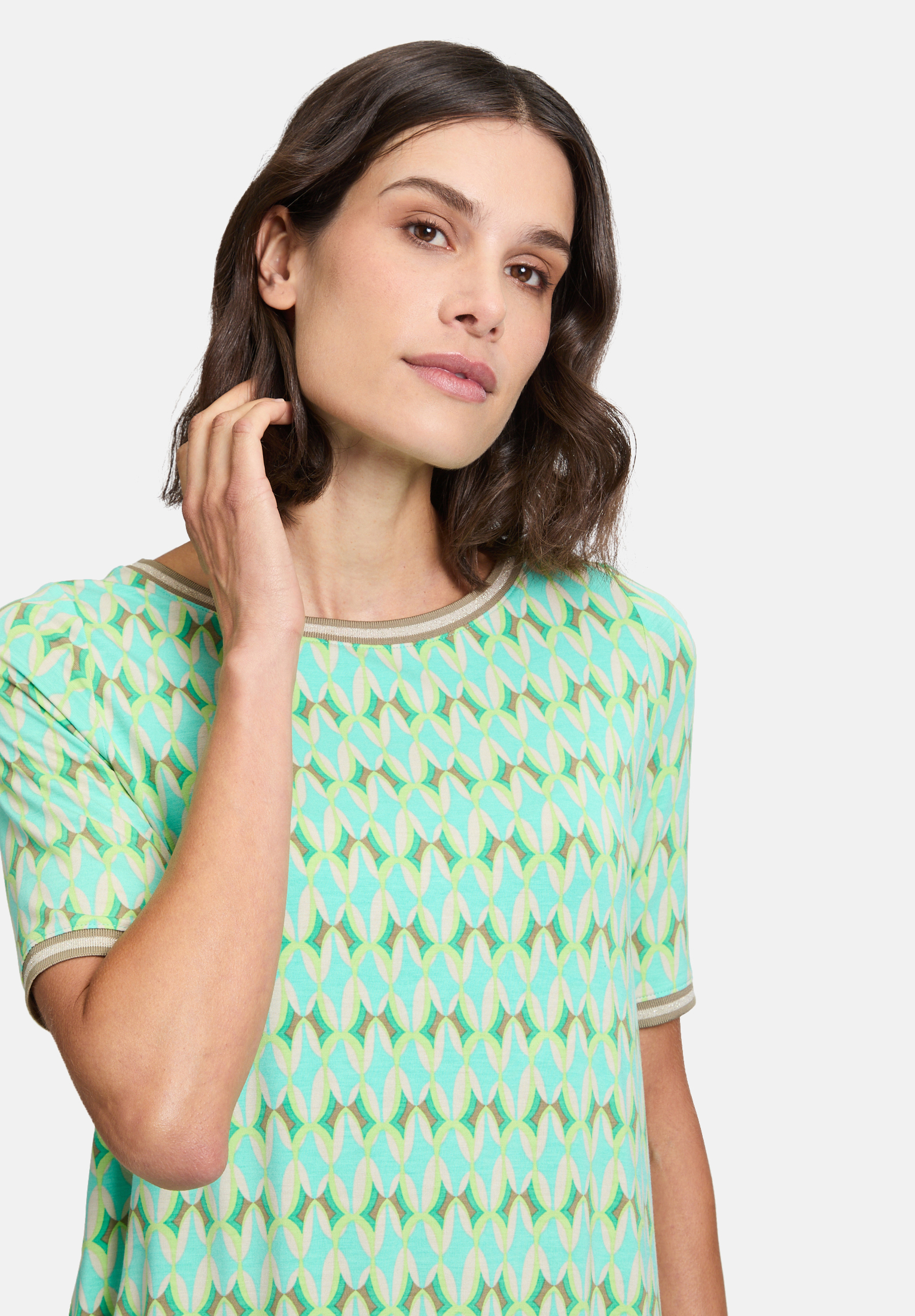 Повседневная рубашка с короткими рукавами и вырезом-лодочкой добавит свежести вашему образу в свободное время благодаря графичному дизайну. Ребристые манжеты добавят игривости. Свободный крой обеспечивает комфортный и стильный образ, универсальный и идеально подходящий для отдыха.