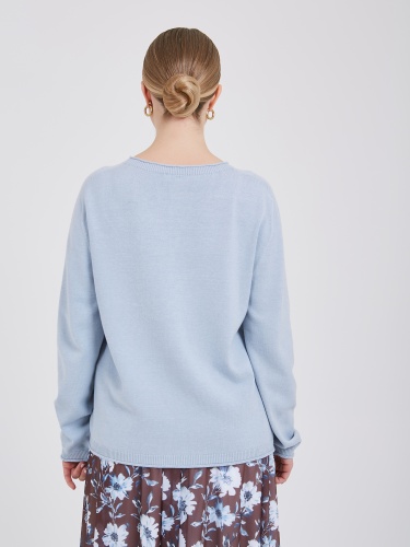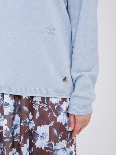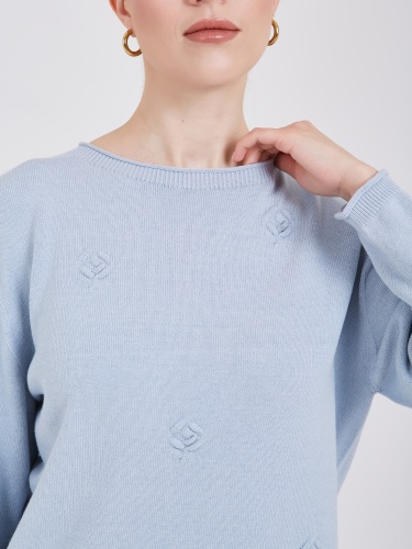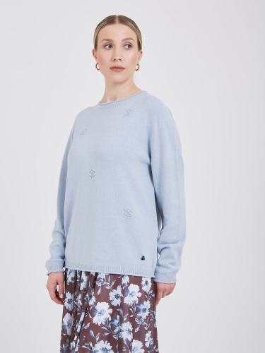 Женский светло-голубой свитер из трикотажа свободного кроя. Длинные рукава и круглый вырез добавляют образу нежности и утонченности. Выраженный узор в виде объемных цветов придает свитеру особую привлекательность. Изготовлен из натурального материала высокого качества, который дарит ощущение комфорта и тепла в прохладные дни.Осень-Зима'25/26. Капсула "Вино из одуванчиков"