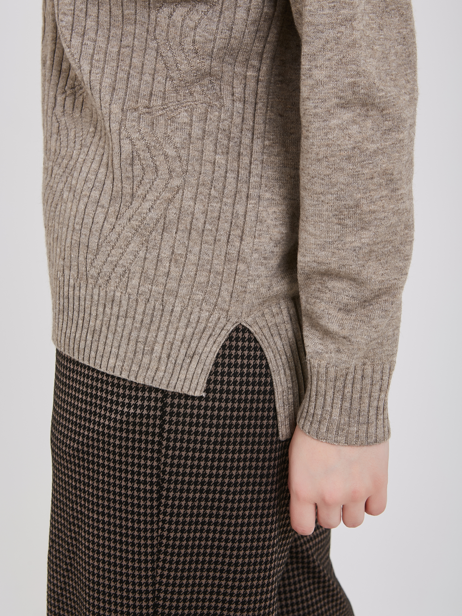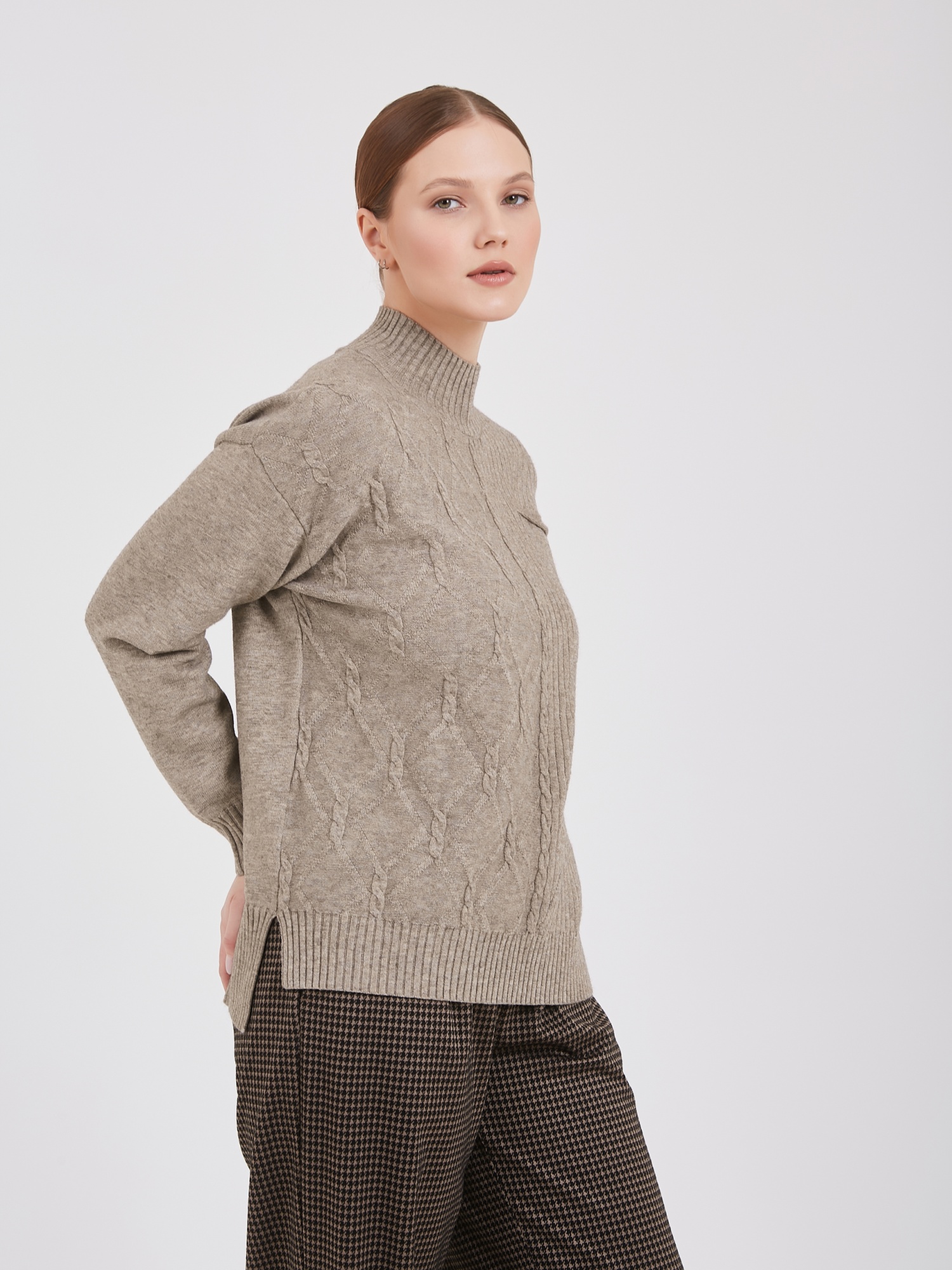 Бежевый свитер классического силуэта. Высокий воротник и длинные рукава обеспечивают комфорт и тепло. Ромбовидный узор с косами на передней части и рукавах добавляет выразительности, а вертикальные рубчики на боковых частях и воротнике придают изделию дополнительную фактуру. Вязаный материал отличается мягкостью и отлично согревает в холодную погоду.Осень-Зима'25/26. Капсула "Вино из одуванчиков"