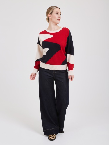 Свитер свободного силуэта с абстрактным узором. Узор выполнен крупными красными, тёмно-синими и кремовыми блоками, создавая динамичный и современный рисунок. Круглый вырез и длинные рукава подчёркивают комфорт и свободу движений. Качественная пряжа обеспечивает мягкость и тепло, делая изделие идеальным выбором для осенне-зимнего сезона. Осень-Зима'25/26. Капсула "Алые Паруса"