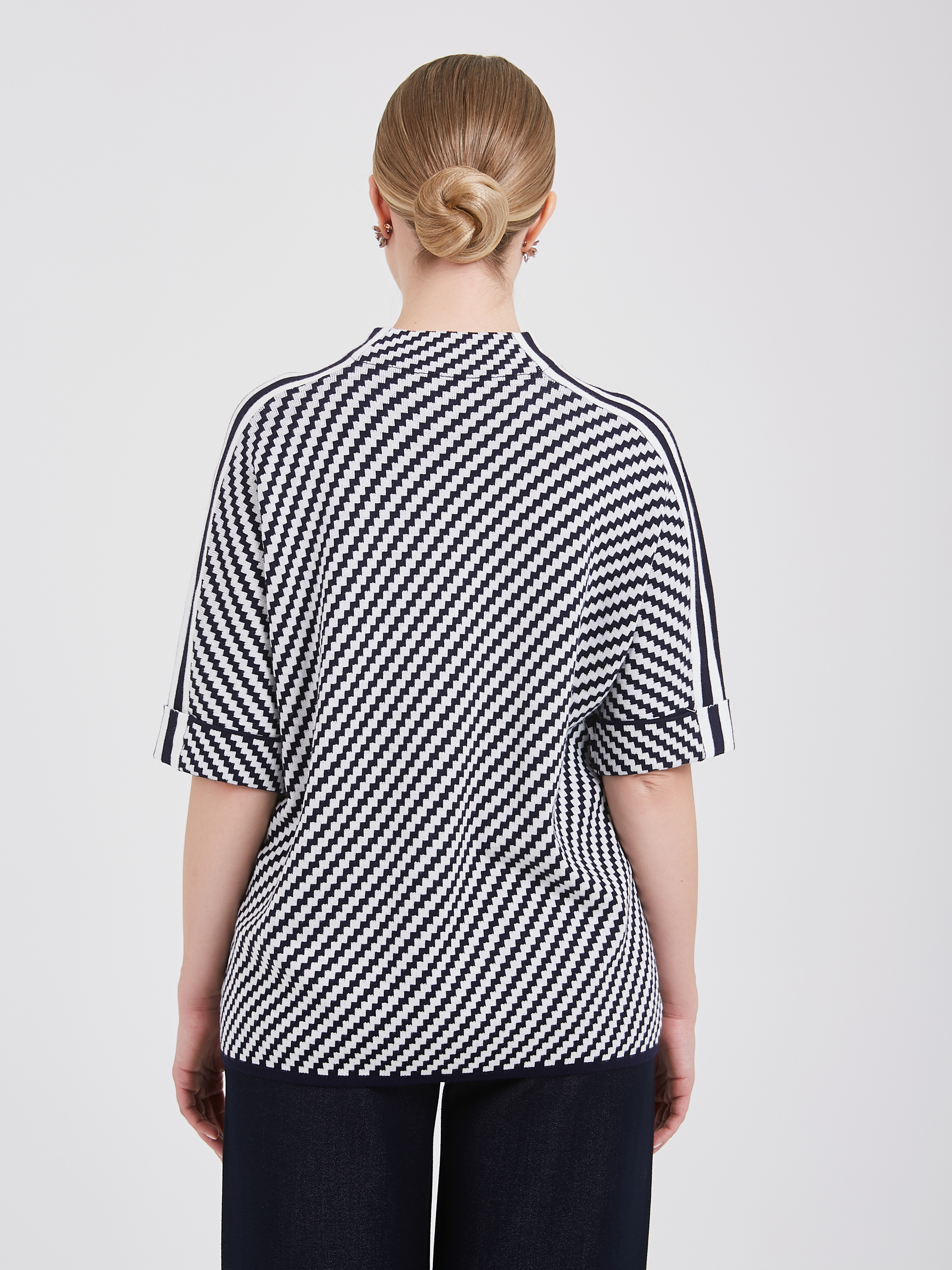 Женский джемпер с интересным шевронным узором из контрастирующих белых и темно-синих полос. Короткие рукава украшены белыми полосками, плавно спускающимися по плечам, создавая динамичный эффект. Небольшой нагрудный карман с оригинальной пуговицей добавляет элемент стиля и функциональности.