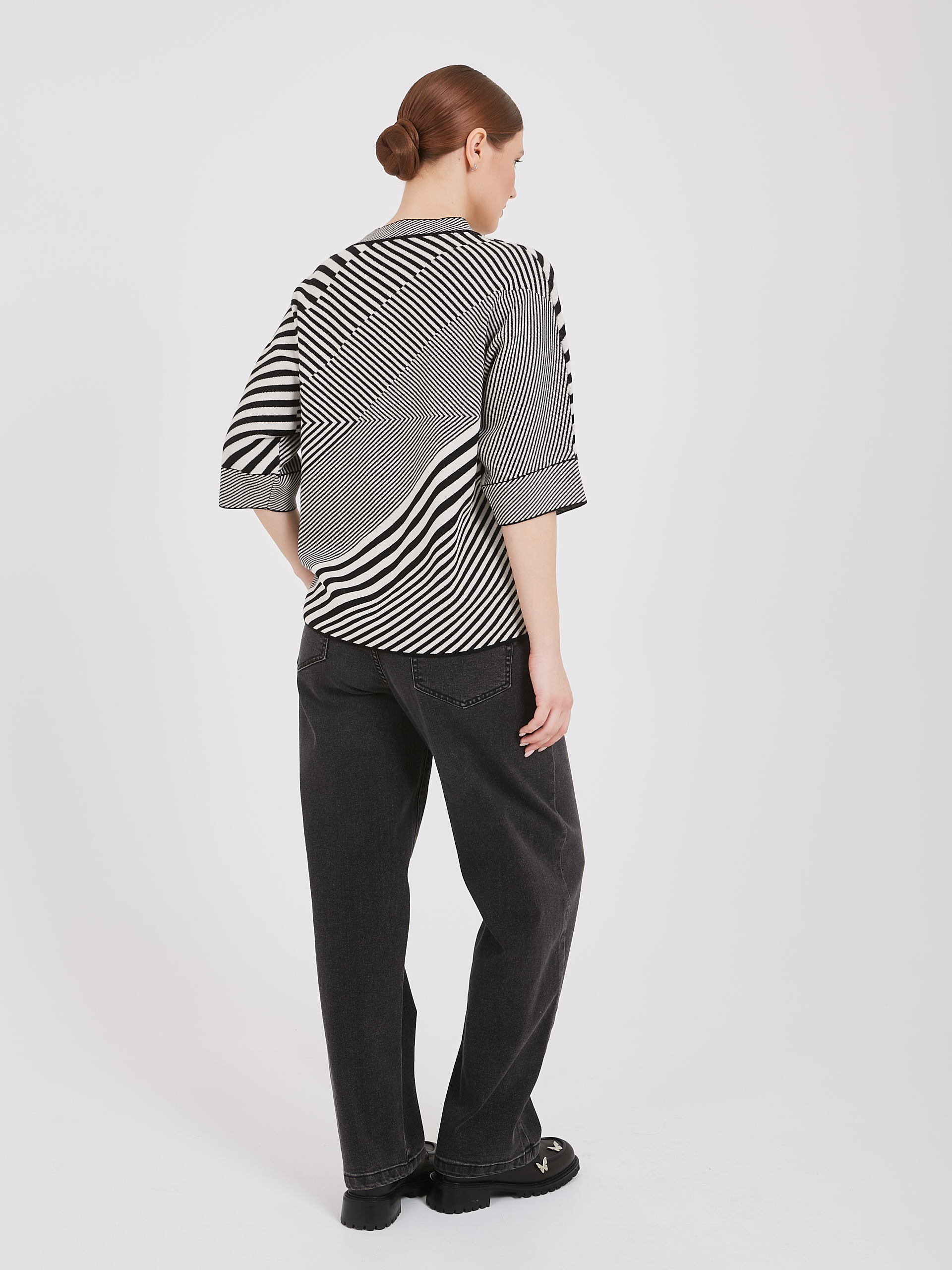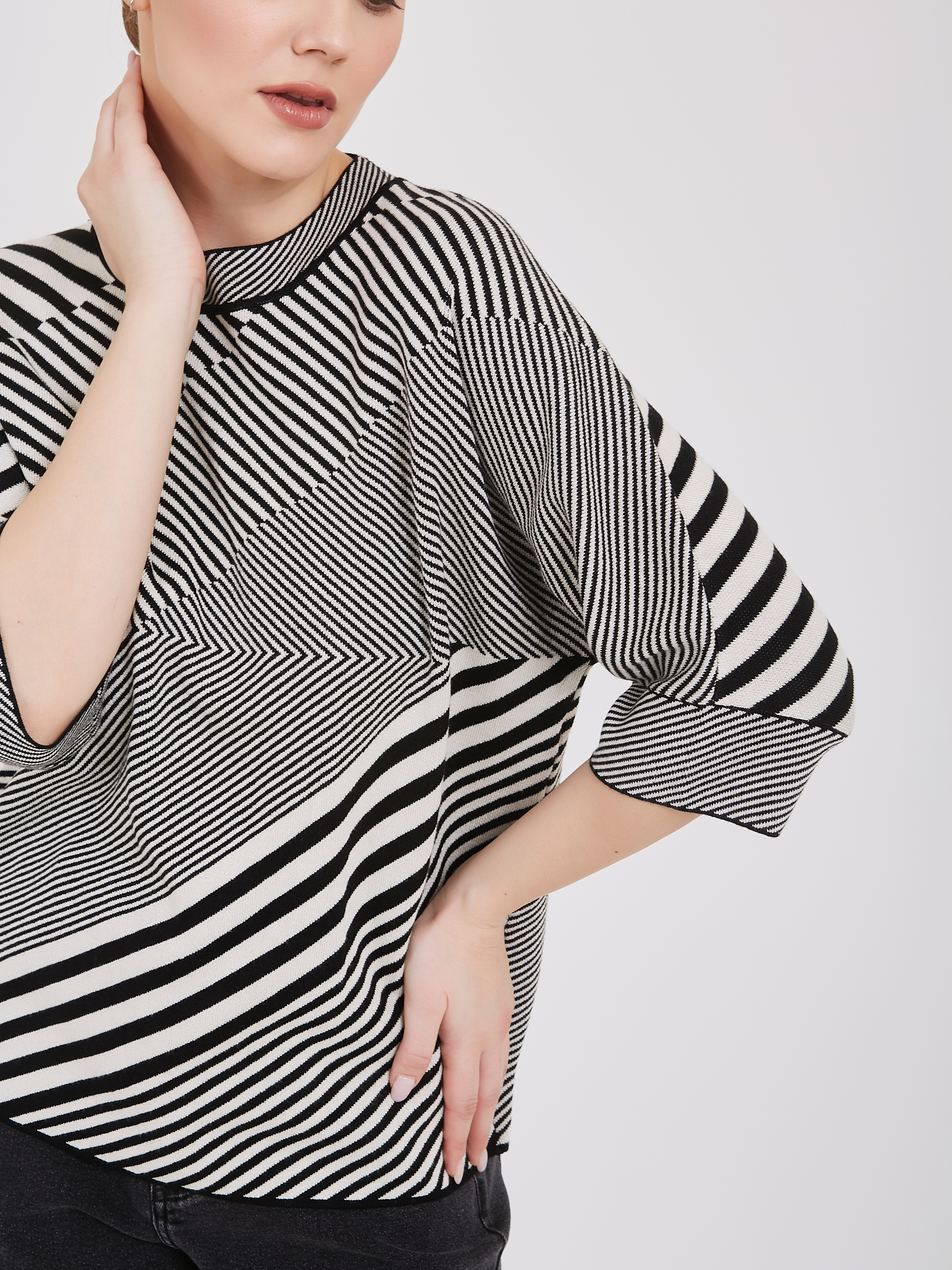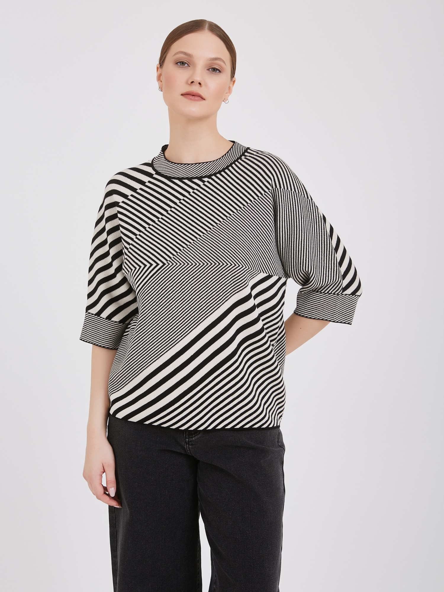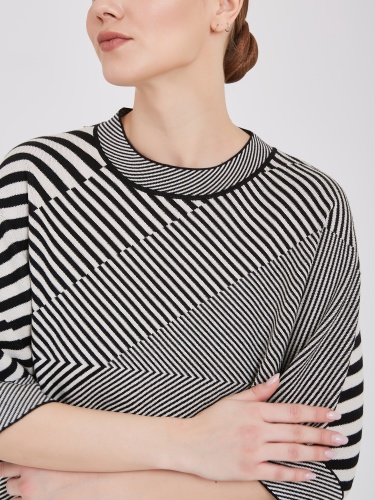 Свитер с рукавами три четверти. Геометрический узор, созданный полосами, идущими в разных направлениях на различных участках изделия, придает свитеру оригинальность и современный вид. Свободный крой и натуральный материал обеспечивают комфорт и уют.Осень-Зима'25/26. Капсула "Вишневый сад"