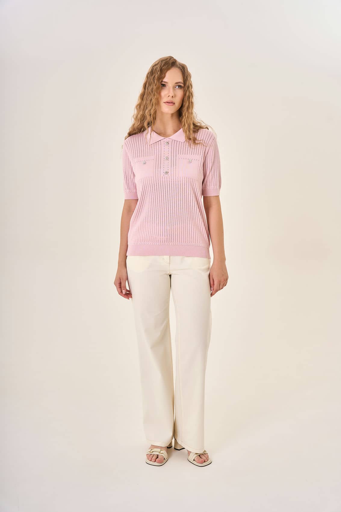 Розовая вязаная рубашка-поло с короткими рукавами. Классический воротник и три декоративные пуговицы придают ей нотку элегантности. Два небольших накладных кармана на груди украшены декоративными деталями, похожими на пуговицы или броши, добавляя шарм и оригинальность. Вертикальный ажурный узор делает рубашку воздушной и привлекательной.Отлично подойдет для создания нежного и современного образа.