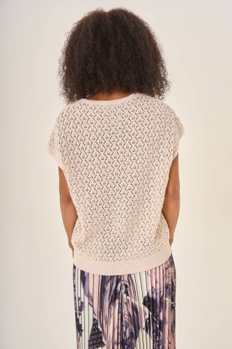 Бежевая вязаная кофта с короткими рукавами. Рельефный узор в виде ромбов добавляет изделию выразительности и уникальности. Мягкий натуральный материал обеспечивает комфорт. Универсальная модель прекрасно дополнит любой наряд, придавая ему уютный и гармоничный вид.