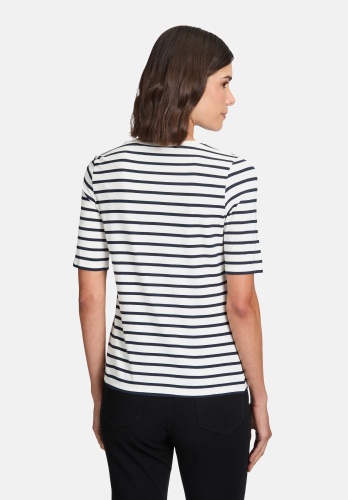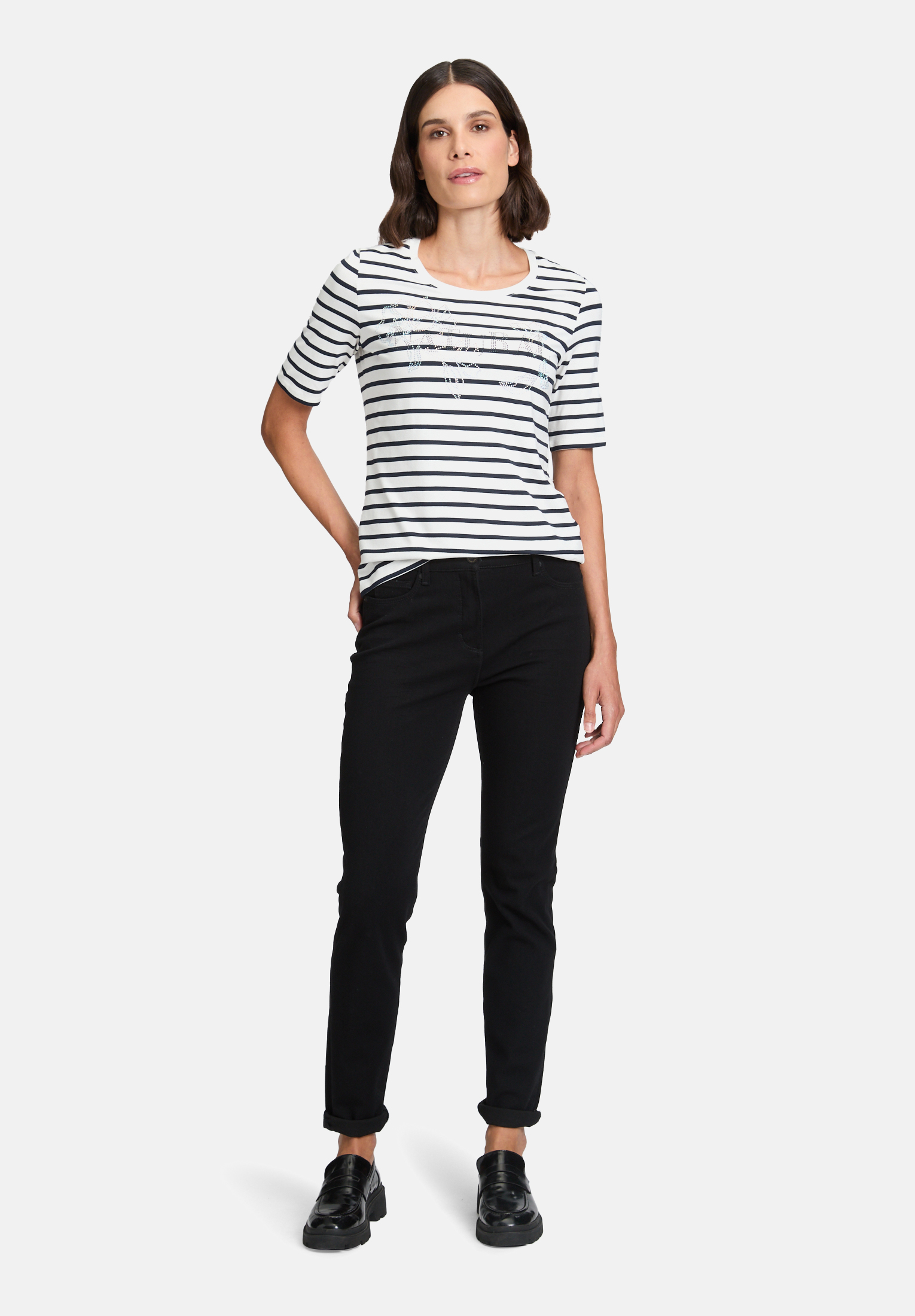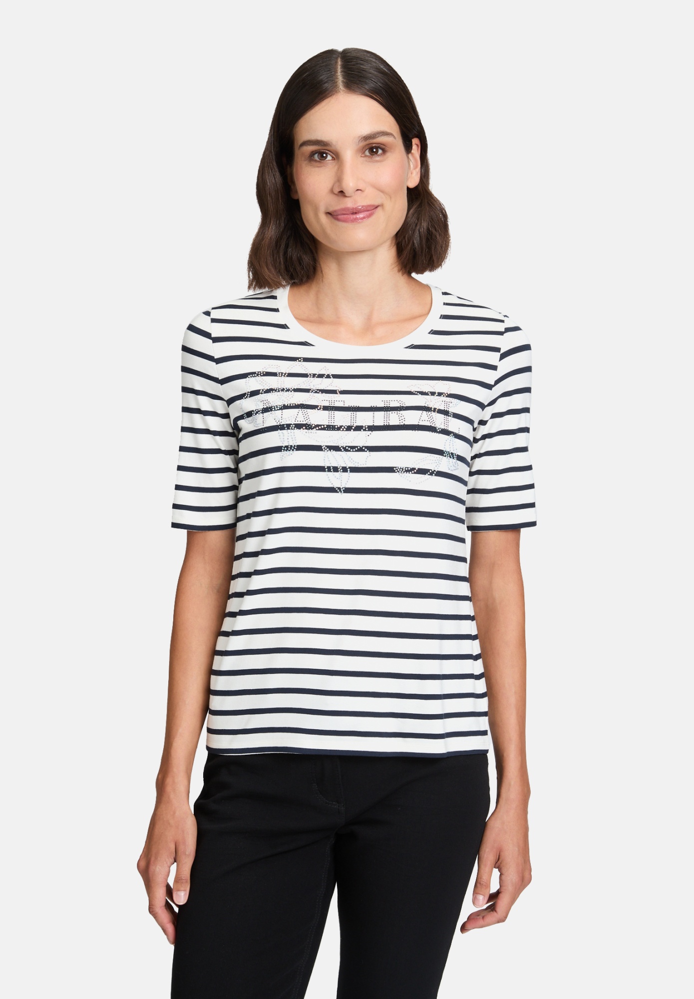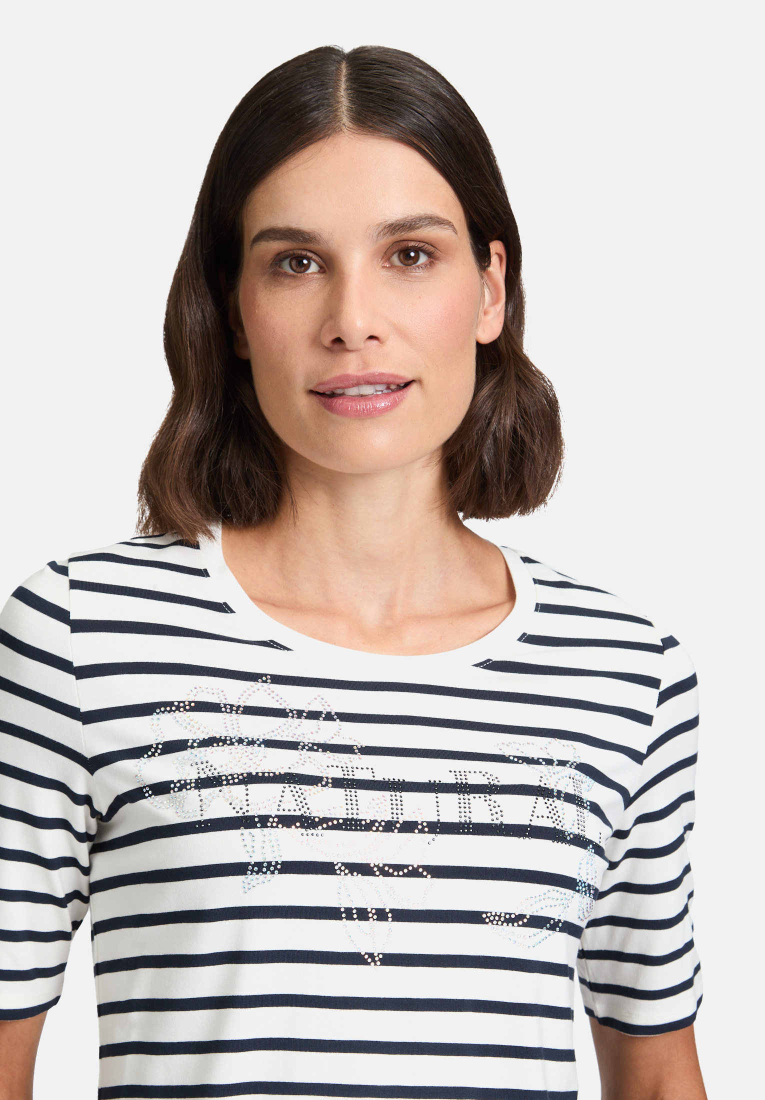 Эта приталенная полосатая рубашка с короткими рукавами и круглым вырезом сочетает в себе классический полосатый дизайн и сверкающие стразы. Облегающий крой создаёт женственный силуэт и делает её элегантной и в то же время непринуждённой вещью. Идеально подходит для стильного повседневного образа.