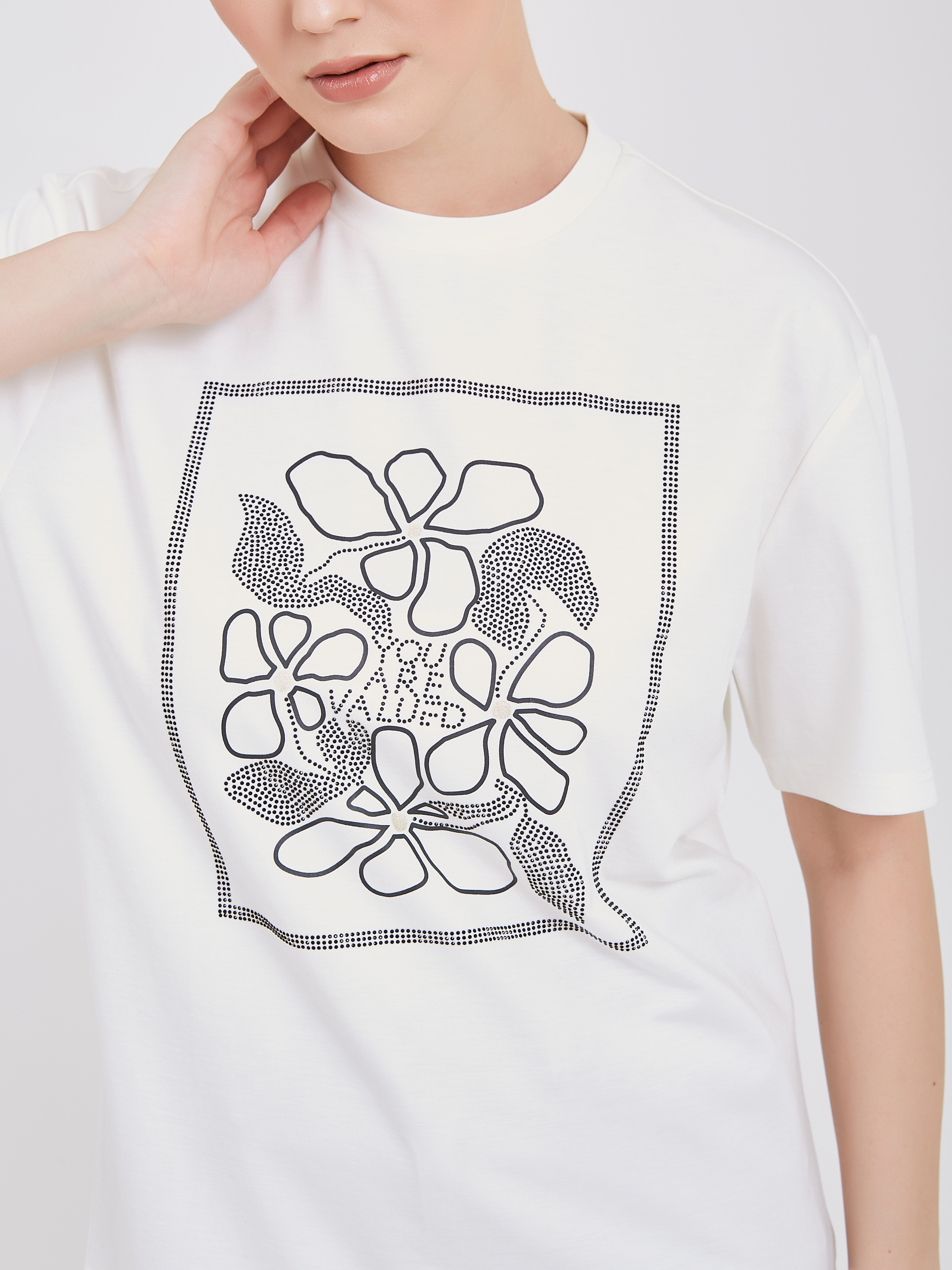 Футболка обладает классическим втачным рукавом и выполнена из более плотного трикотажа, чем летние варианты. Благородный чернильно-чёрный оттенок выгодно подчёркивает оригинальную аппликацию из золотых страз, придавая изделию дороговизну и шик. Футболка подойдёт женщинам разных фигур, идеально вписываясь в городской стиль и позволяя создать стильный и утончённый образ.