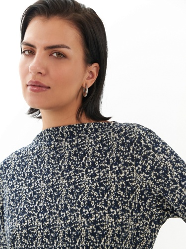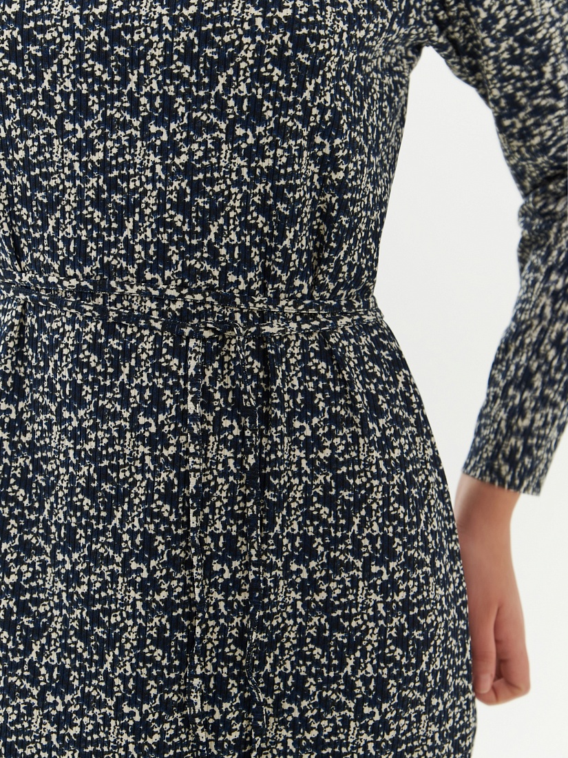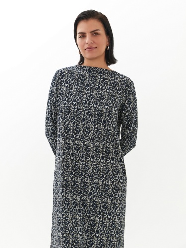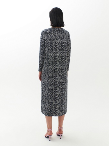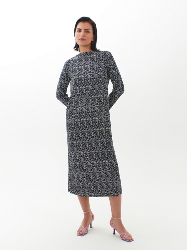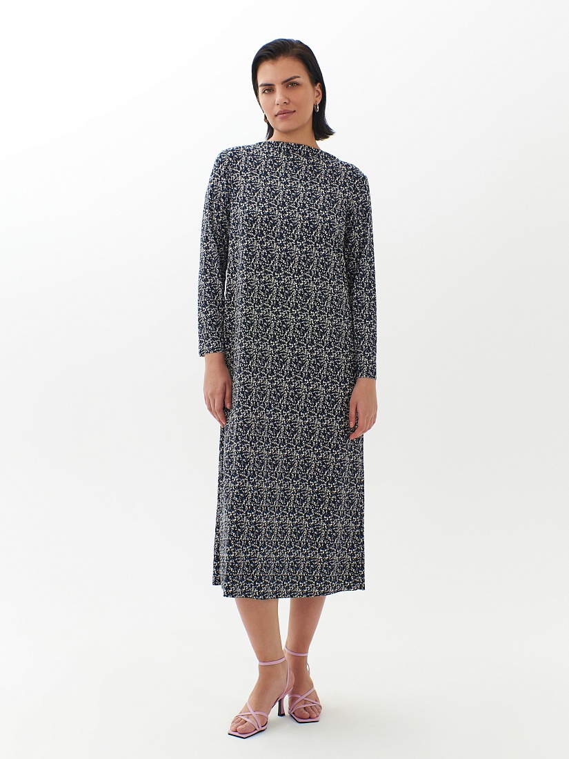 Прямое платье-миди из смесовой вискозы - идеальная вещь для переходного сезона. Длинные рукава создают уютный образ, вырез щель добавляет элегантности. Мелкий пятнистый принт делает платье идеальным выбором как для особых случаев, так и для повседневного ношения.