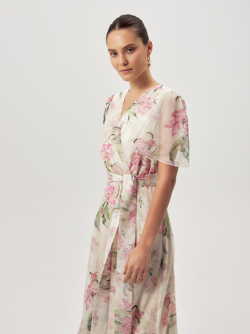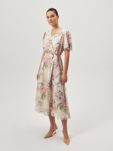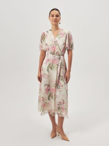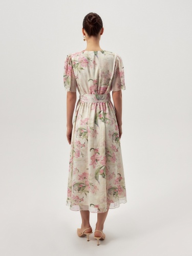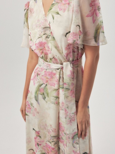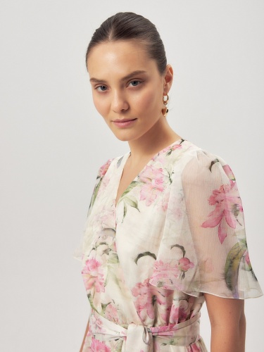 Женственное платье миди из принтованного шифона с цветочным принтом. Платье полуприлегающего силуэта с V-образным вырезом и ложным запахом, отрезное по талии с резинкой. Рукав свободный "крылышко". В комплект входит пояс из основной ткани.