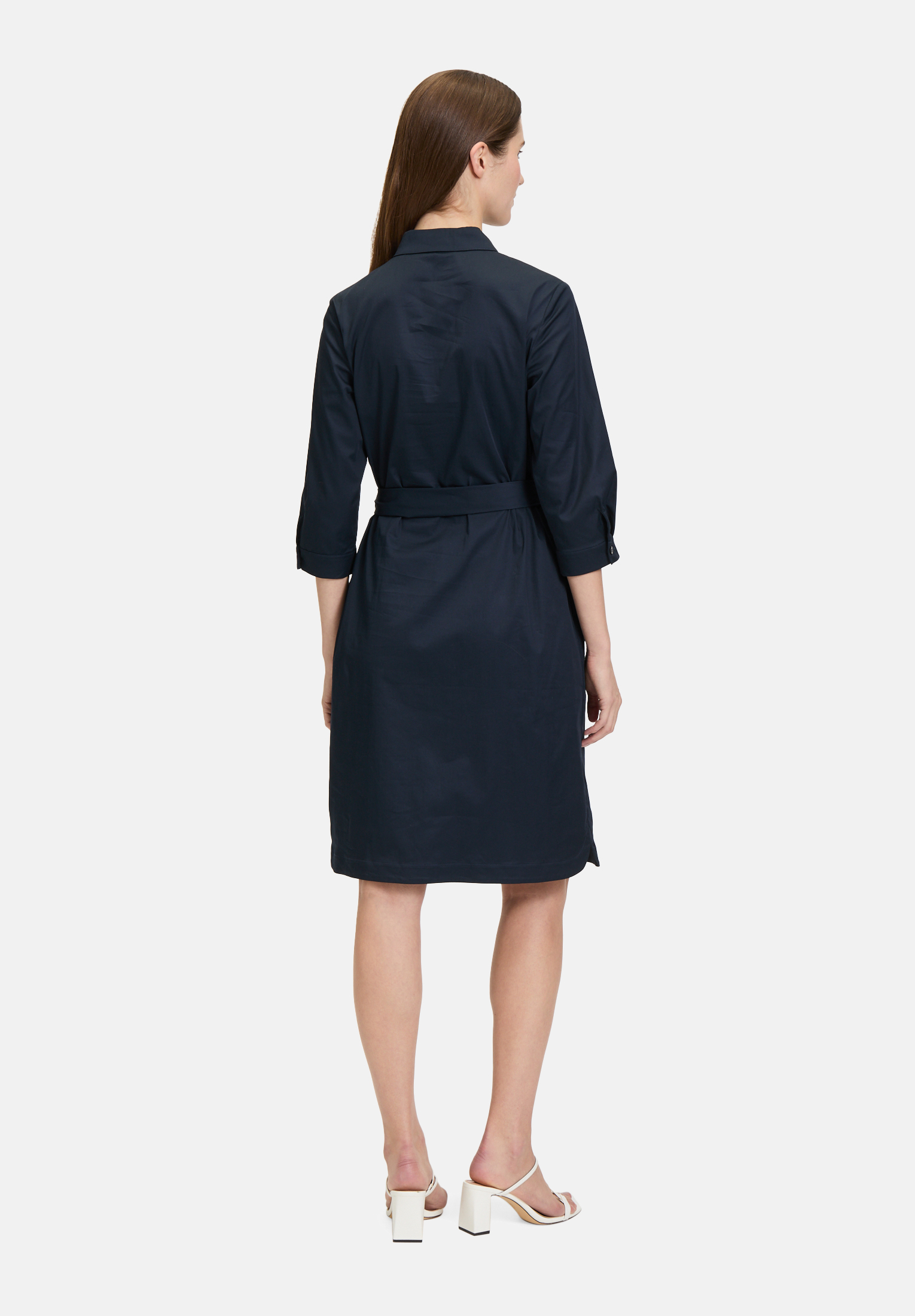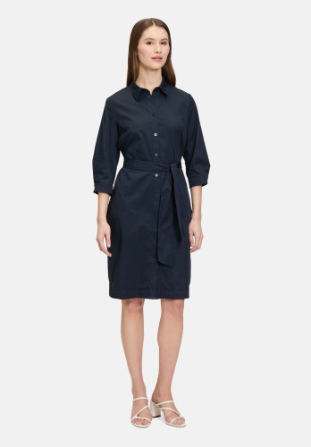 Это повседневное платье длиной до колена с рукавами 3/4 и рубашечным воротником сочетает в себе комфорт и стиль. Облегающий крой и однотонная ткань создают непринужденный образ, а планка с пуговицами гармонично дополняет дизайн.