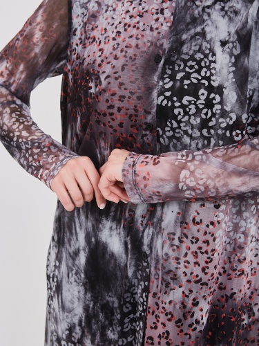 Женское длинное полупрозрачное платье с оригинальным принтом, сочетающим пятнистый узор и размытые пятна черного, розового и белого оттенков. Длинные рукава и воротник-стойка придают образу изысканность и утонченность. Легкий струящийся материал подчеркивает женственность и создает ощущение воздушности. Осень-Зима'25/26. Капсула "Вишневый сад"