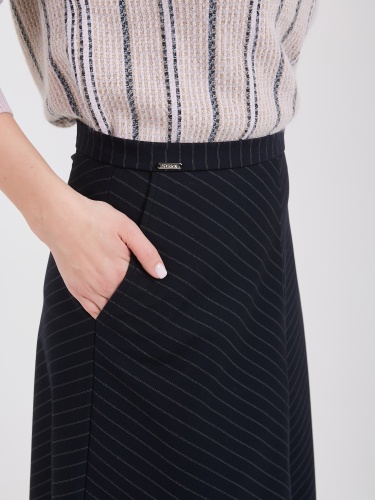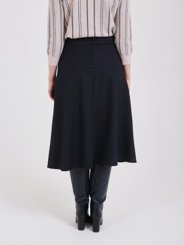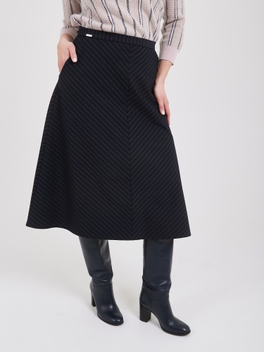 Юбка средней длины из изысканной чёрной ткани с едва заметной серой полоской. Легкий расклешённый фасон подчёркивает изящность фигуры, начиная от аккуратного чёрного пояса с утончённой металлической деталью. Два удобных боковых кармана гармонично дополняют дизайн, придавая образу особый шарм и функциональность. Осень-Зима'25/26. Капсула "Лиловый шар"