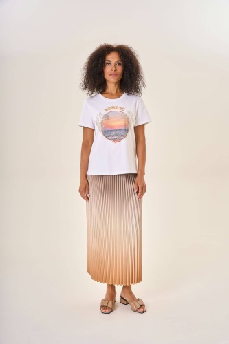 Плиссированная юбка средней длины с плавным градиентом,перетекающим от благородного серо-коричневого к роскошному золотистому оттенку. Завершающий штрих образа — контрастный чёрный пояс, подчёркивающий талию и добавляющий динамики силуэту.