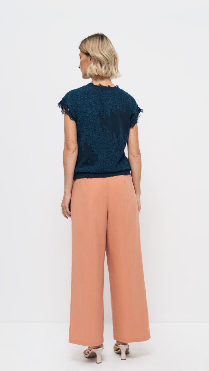 Жилет свободного прямого силуэта изготовлен из качественной смесовой хлопковой пряжи, обеспечивающей прочность и долговечность изделия. Жилет дополнен гранжевыми деталями, имитирующими распущенные протяжки по пройме и низу изделия, что придаёт базовой форме почти художественный вид. Цвет «синяя глубина» отлично сочетается с различными оттенками в комплектах.
