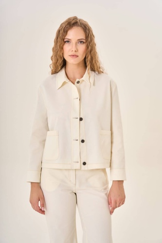 Жакет с классическим отложным воротником и длинными рукавами демонстрирует сдержанный шик. Пяти тёмных пуговиц достаточно, чтобы подчеркнуть строгий силуэт и добавить аккуратности общему виду. Пару накладных карманов впереди удачно завершают композицию, обеспечивая функциональность и дополняя образ лаконичностью деталей. Прочный и качественный материал жакета гарантирует комфорт даже в самую переменчивую погоду.